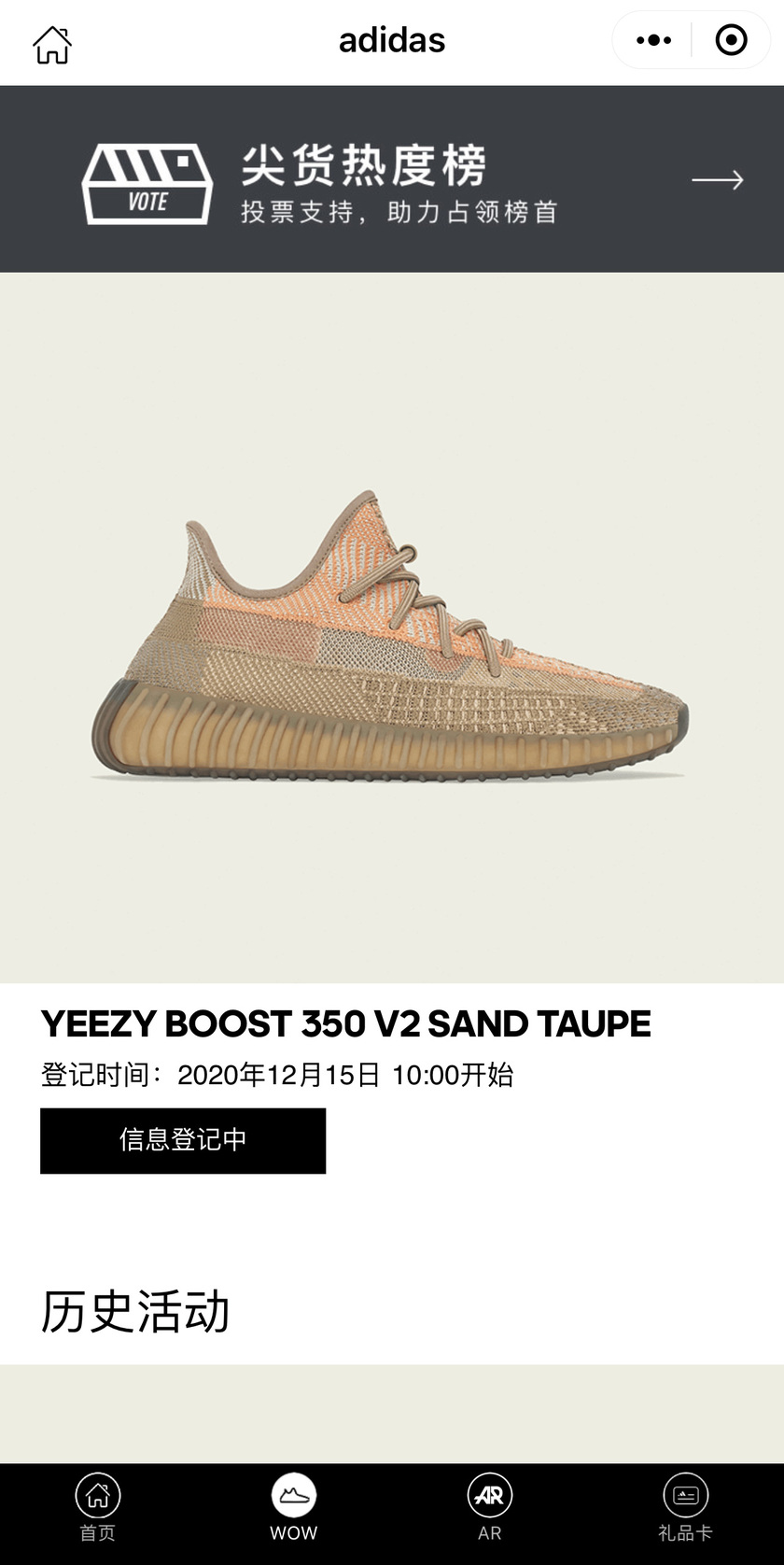 因外观酷似两款美洲限定 “Clay” 和 “Earth” 的结合而备受关注的 Yeezy Boost 350 V2 “Sand Taupe” 配色,今日开启了小程序登记。