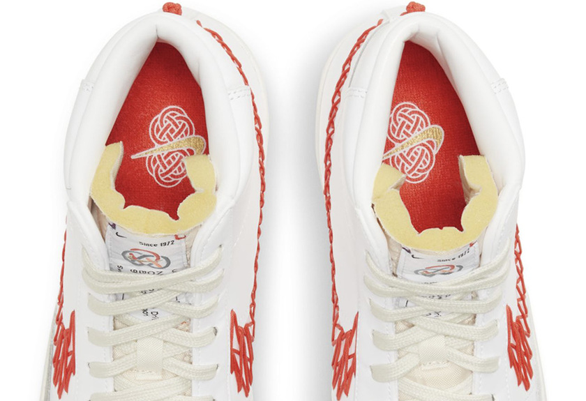 这款 CNY 配色采用纯白色调主打,皮革材质与小部分麂皮拼接,质感出众。而整双鞋最抢眼的设计则是鞋侧红线勾勒的 Swoosh ,酷似中国结风格的编织手法,直击 CNY 中国新年主题。