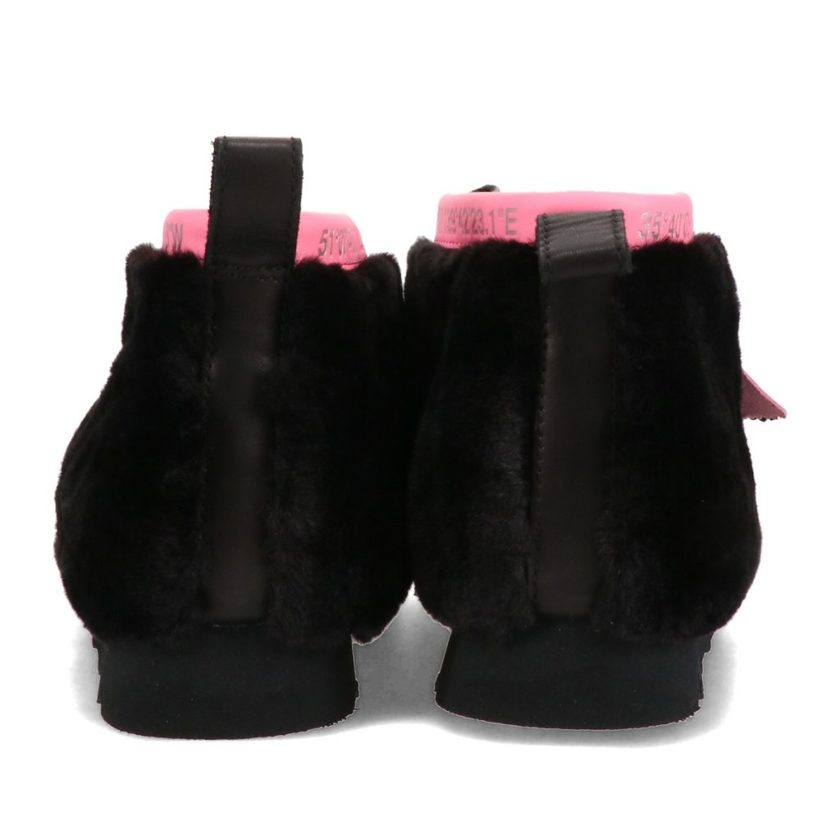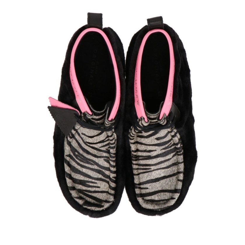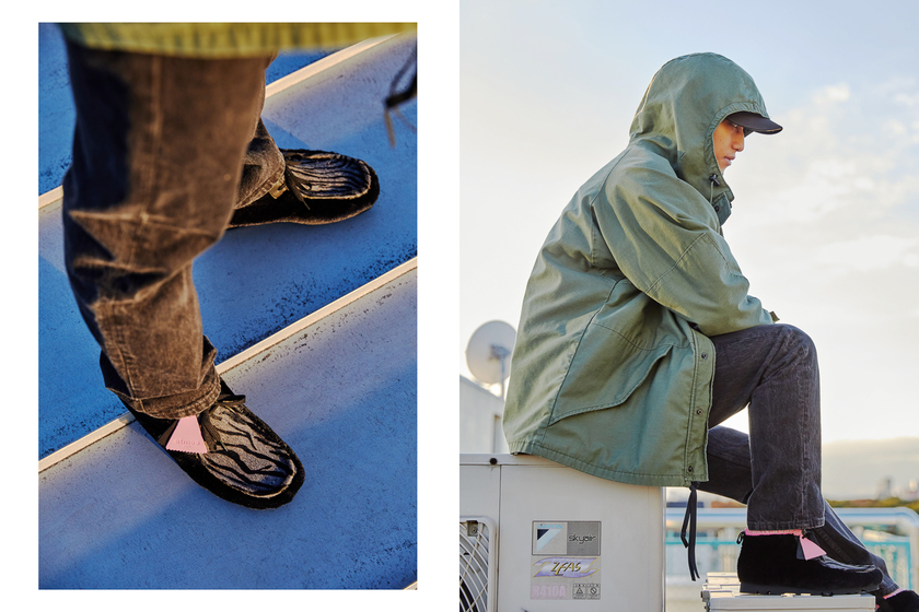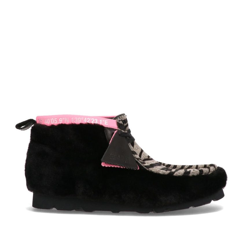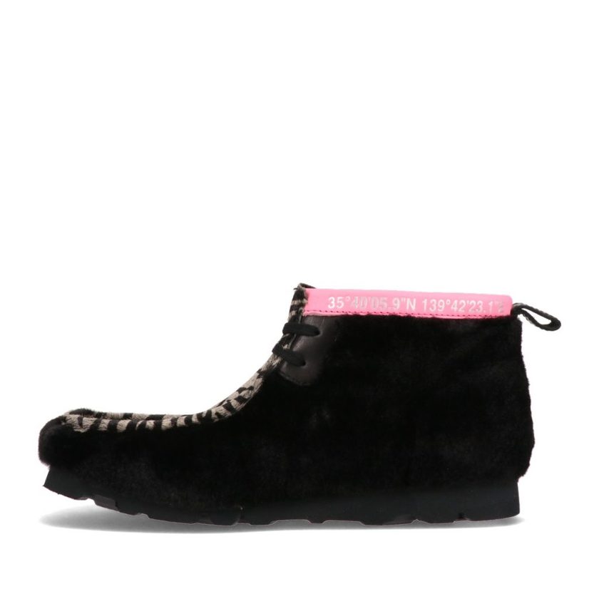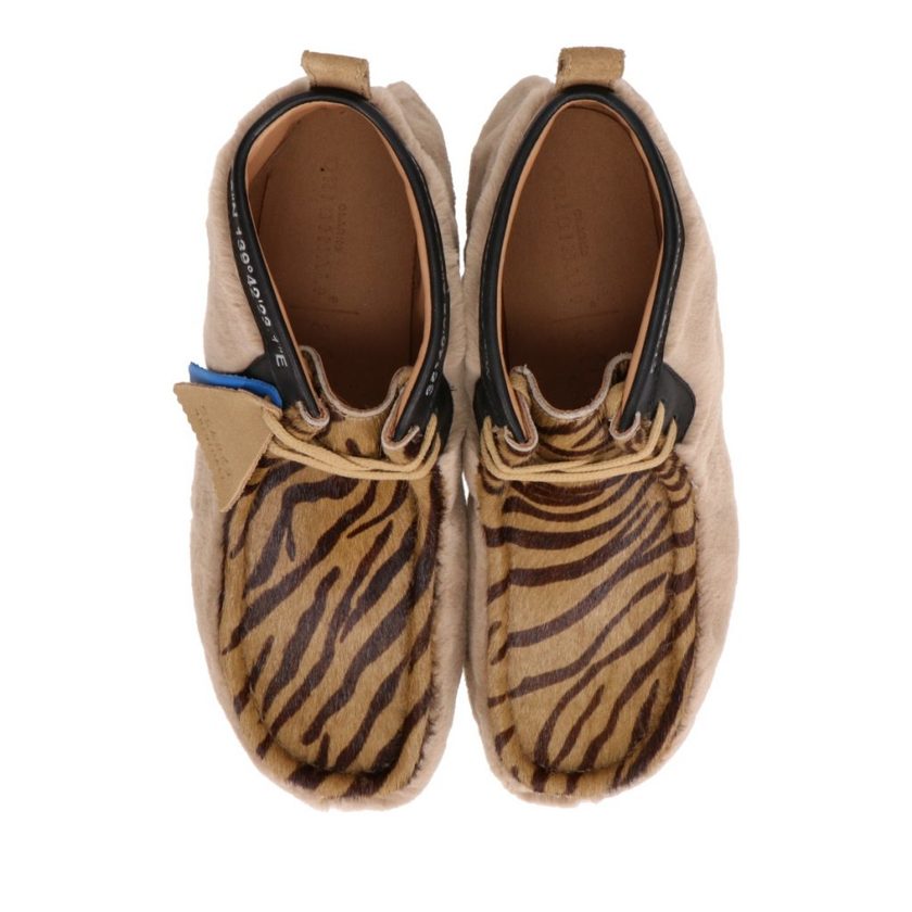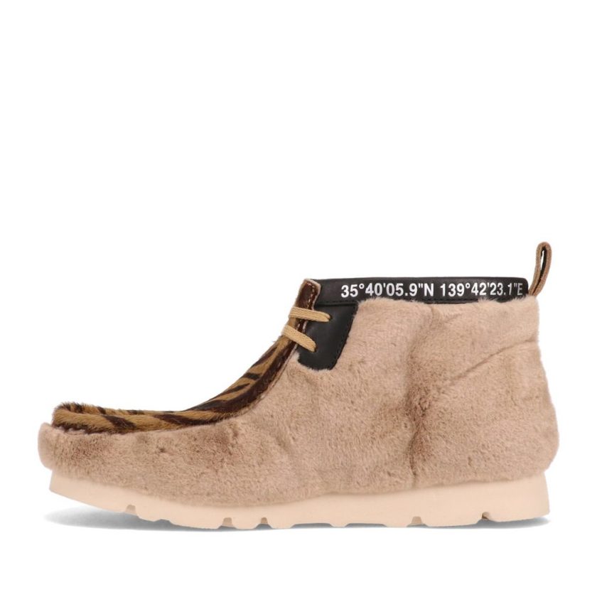 “Wallabee Gen”鞋身以atmos 惯用的动物纹理主打,共有黑、棕两款配色,鞋履上 atmos 总部所在地原宿和 Clarks ORIGINALS 成立时英国南部的城市坐标点缀,彰显特殊身份。