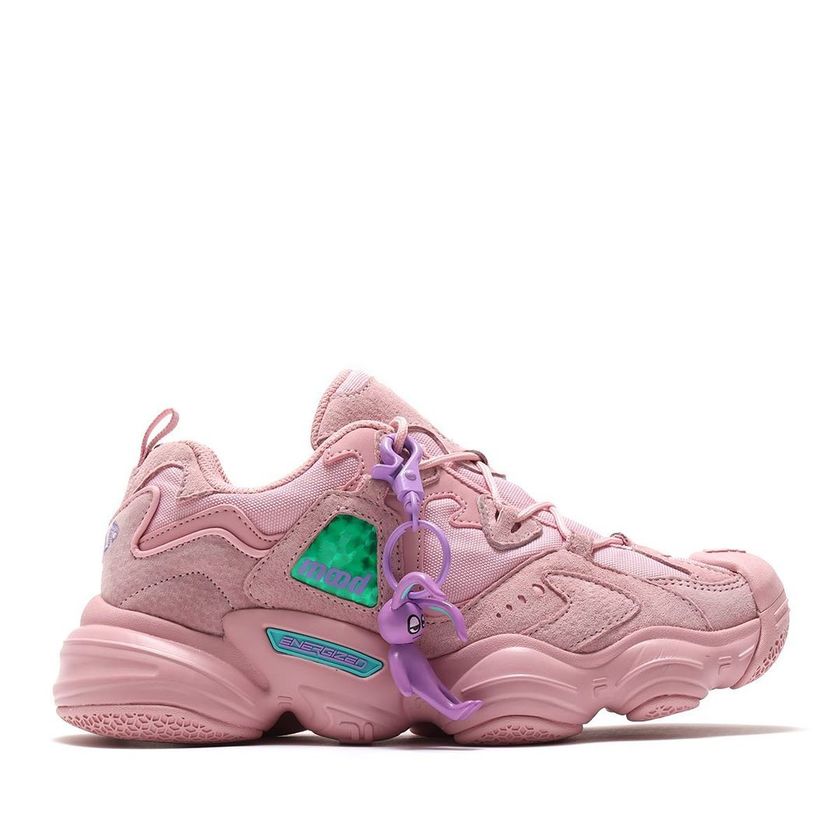 鞋款使用大面积的淡粉色来进行呈现,多种物料拼接,营造出丰富的视觉层次感。另外,鞋侧点缀的荧光绿镭射拨片、鞋带上挂着的“Rabbit”吊坠等细节,也提升了吸睛度。