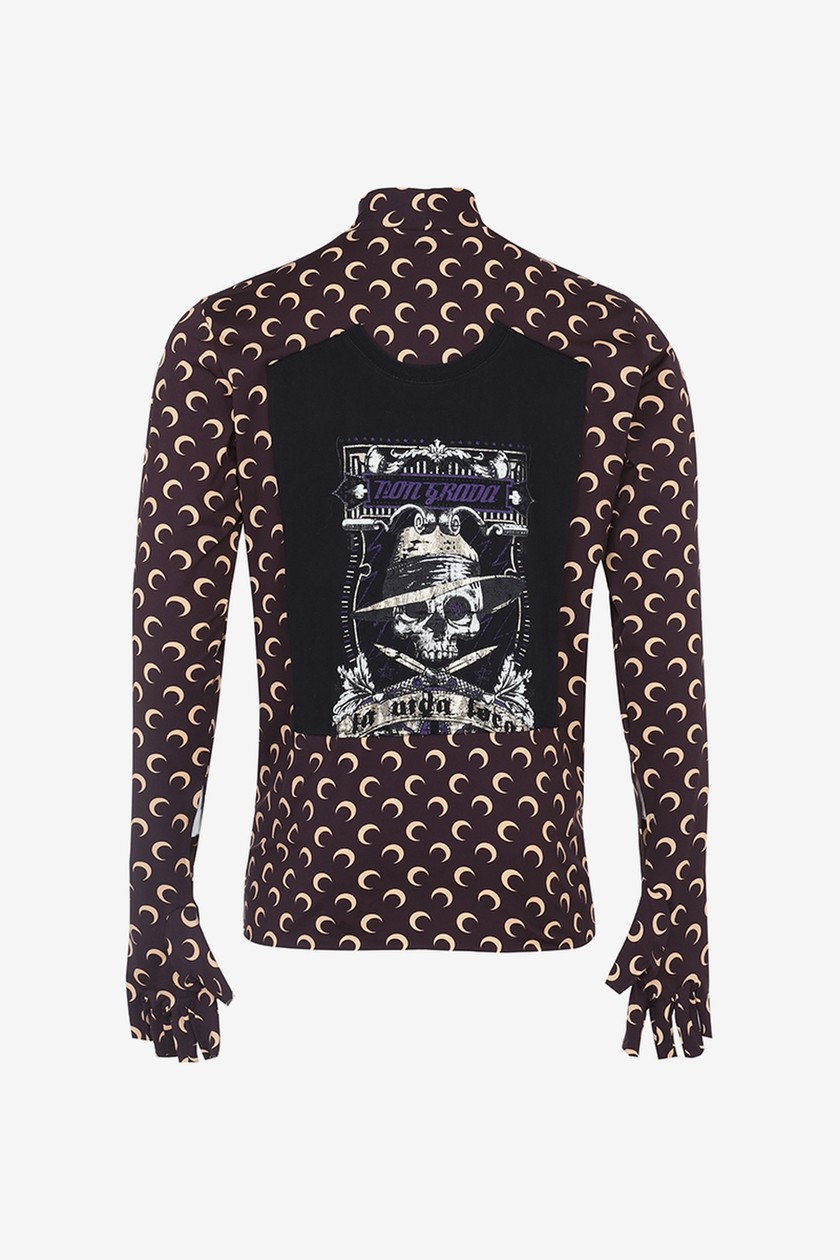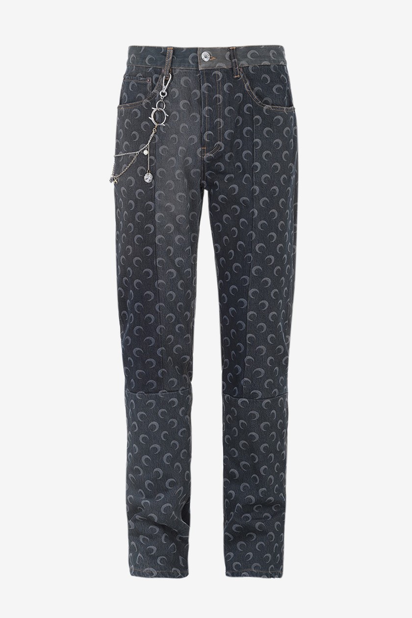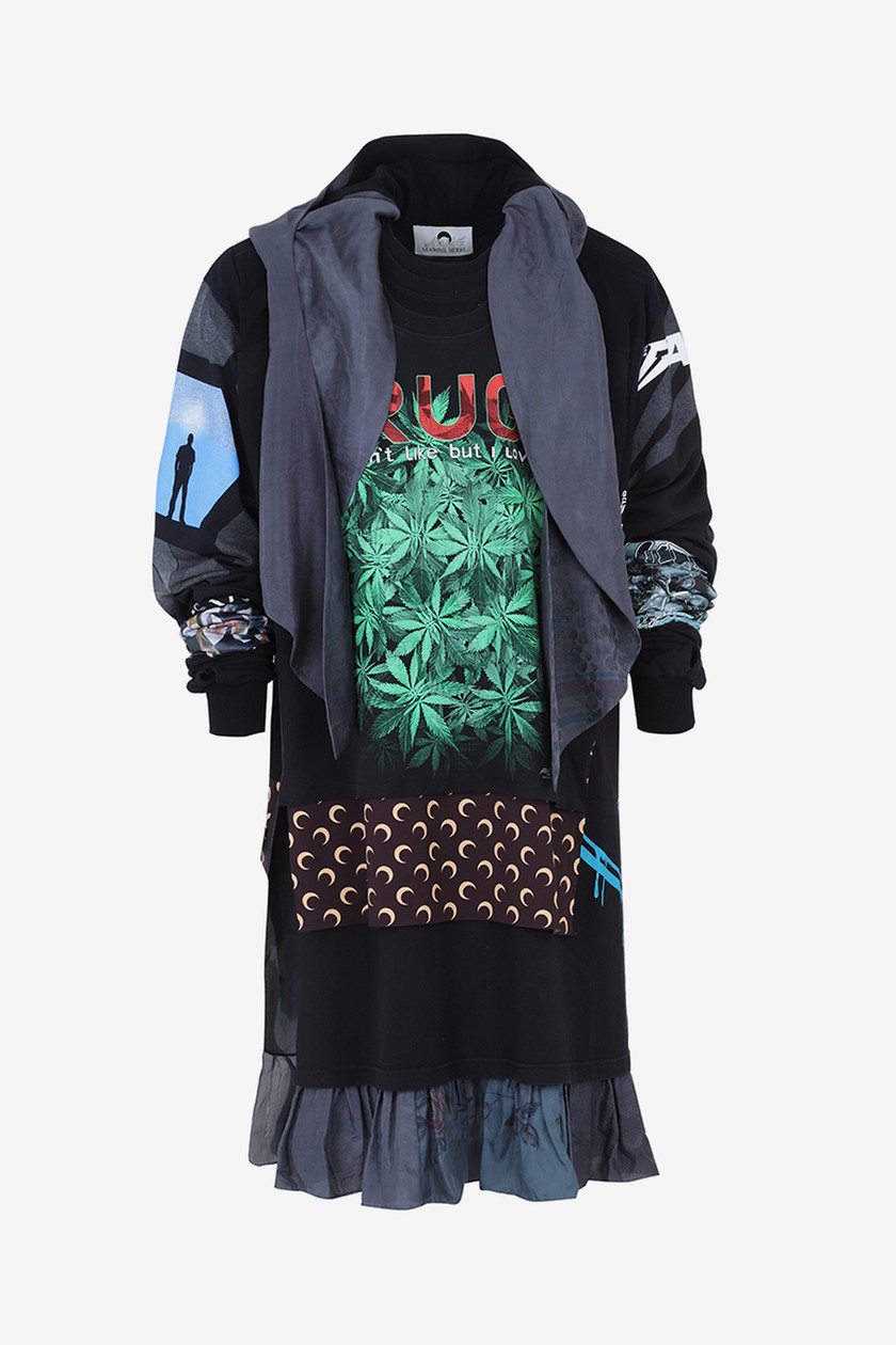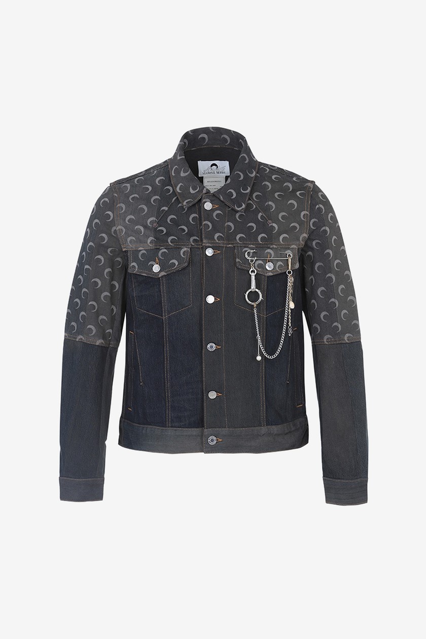 系列带来丹宁夹克、裤装、羽绒外套、打底衫、头套等单品,在设计上主要以 Marine Serre 标志性半月元素为主,搭配朋克风印花,抢眼度十足。