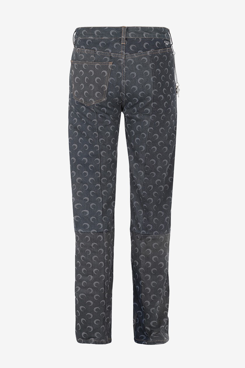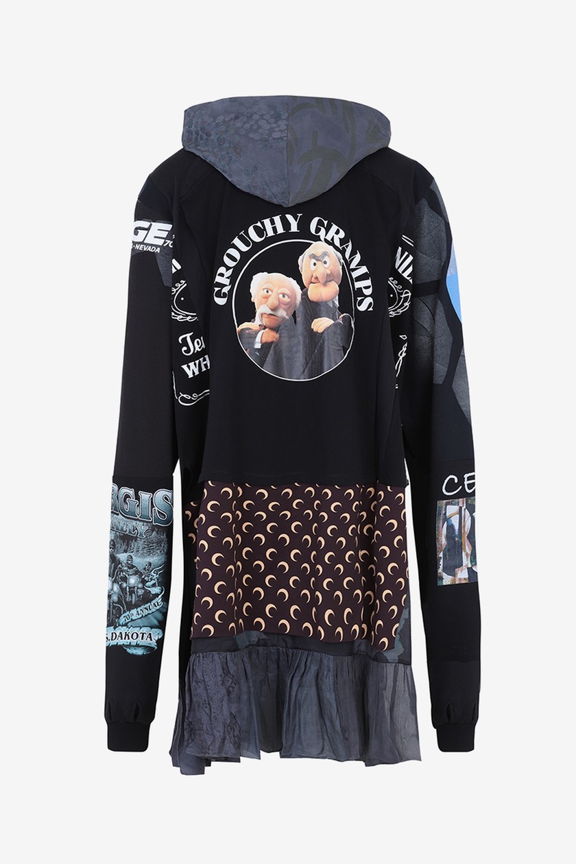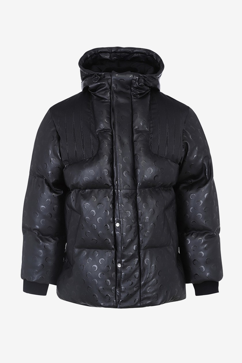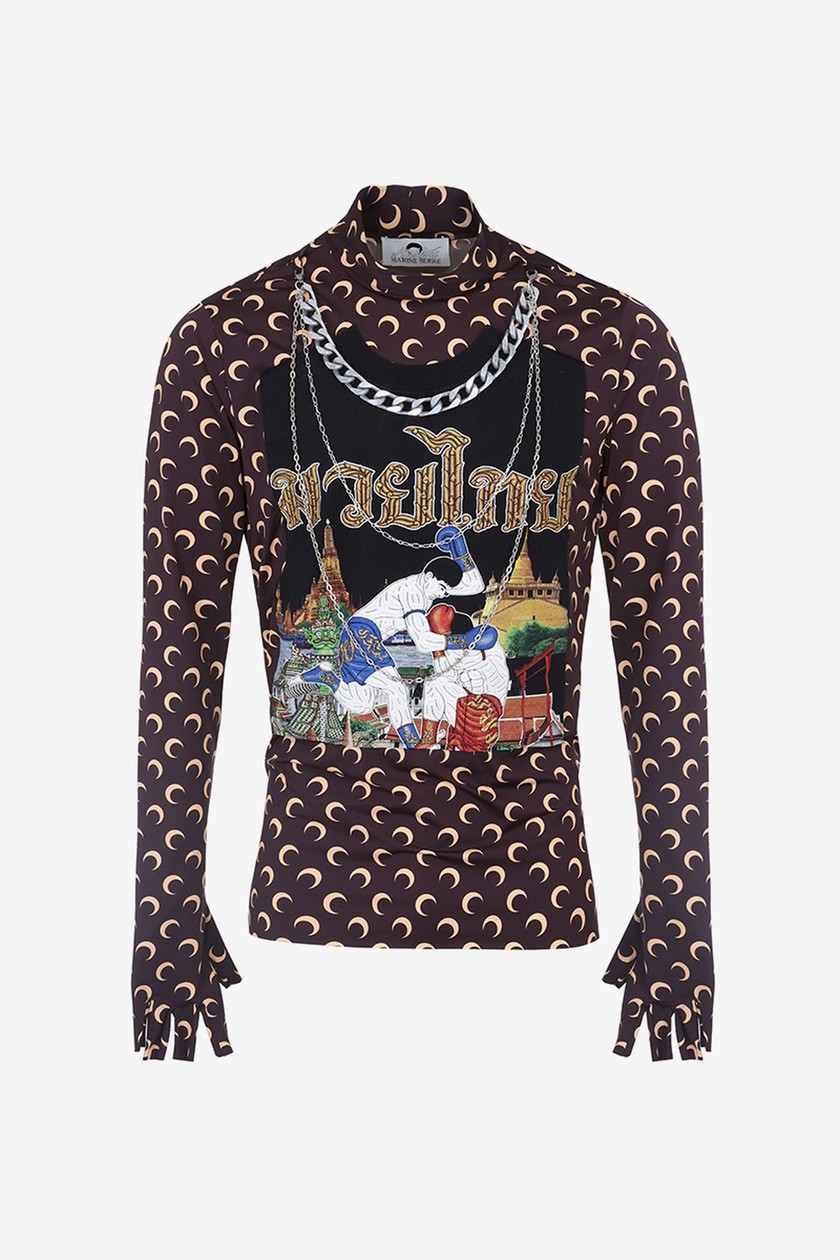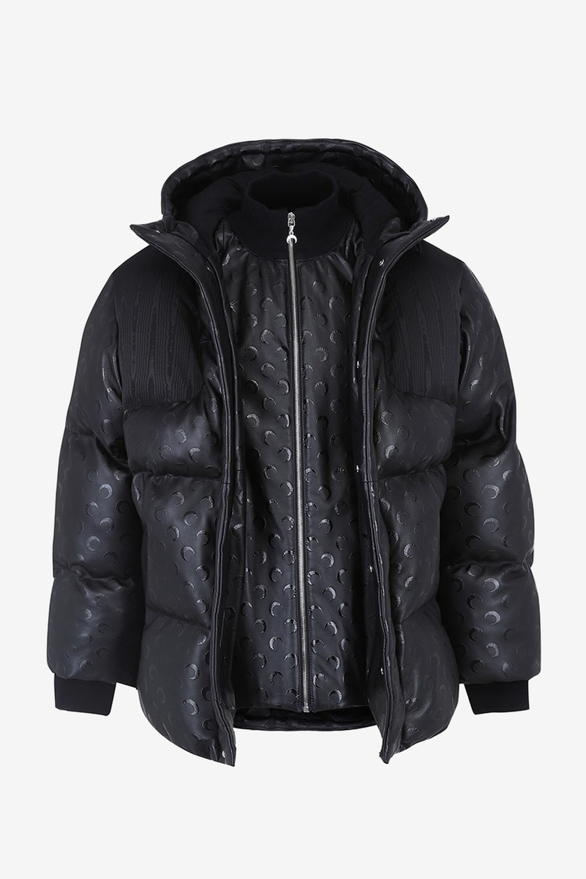 系列带来丹宁夹克、裤装、羽绒外套、打底衫、头套等单品,在设计上主要以 Marine Serre 标志性半月元素为主,搭配朋克风印花,抢眼度十足。