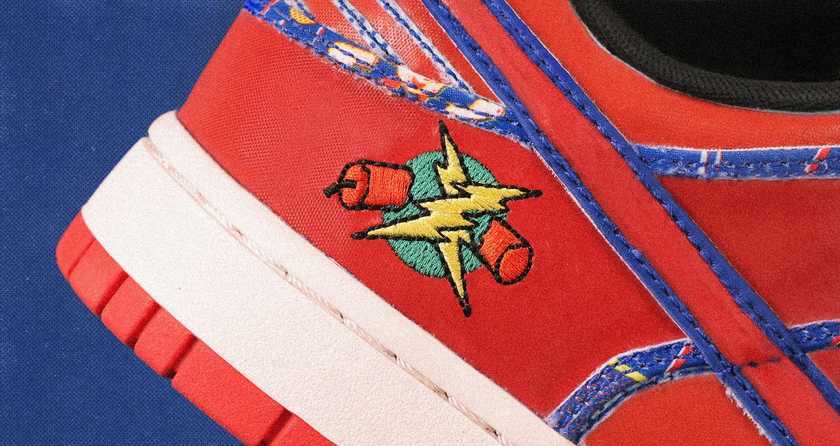 鞭炮 Dunk Low 以撕撕乐+刮刮乐设计主打,鞋面共有三层。外层蓝色,象征鞭炮包装纸;中层红色,还原鞭炮本身颜色;底层黑灰色,代表鞭炮燃尽后地上的火药残留。每一层设计都无比精妙,且契合主题。