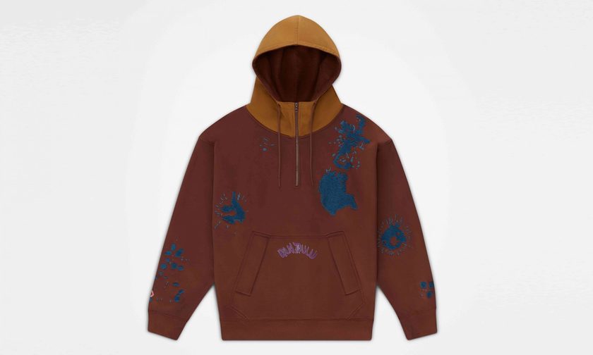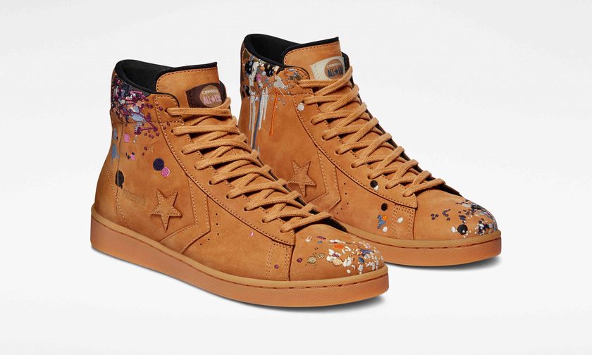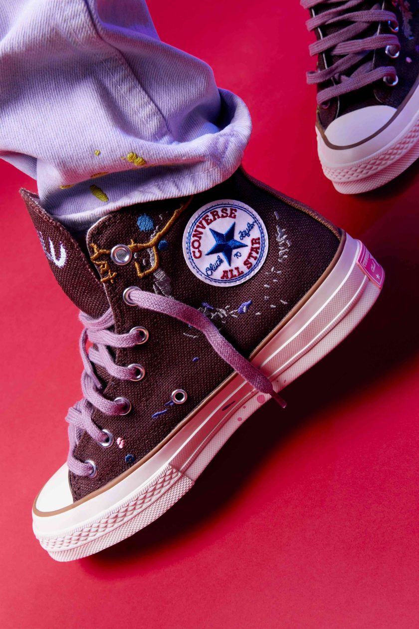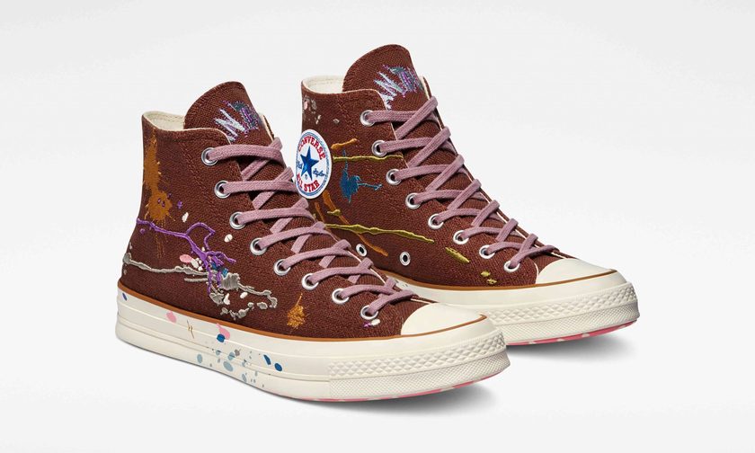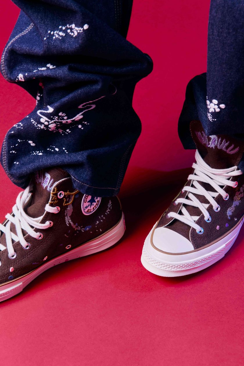 鞋款设计以 Bandulu 标志性美学——刺绣滴墨细节主打, Pro Leather 采用亚麻色和浅蜜色的混合色牛巴革制成,而 Chuck 70 则采用卡布奇诺配色帆布搭配泼墨刺绣呈现。