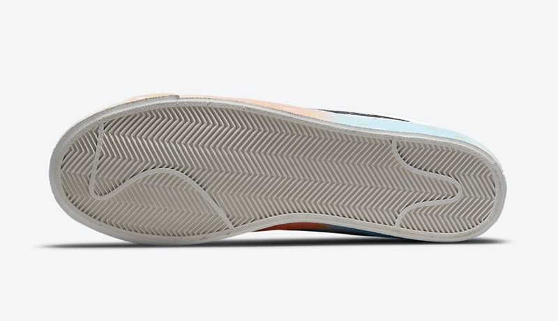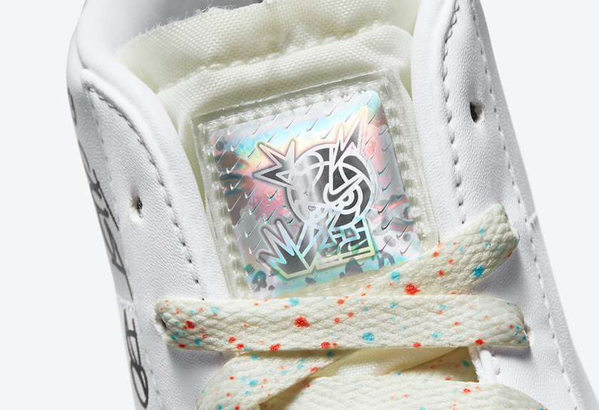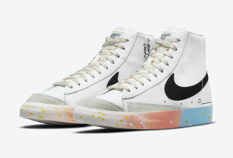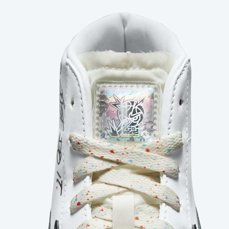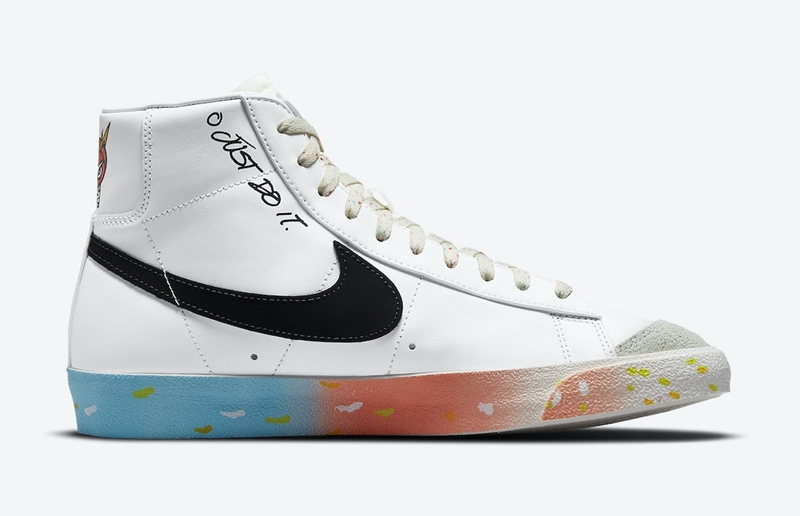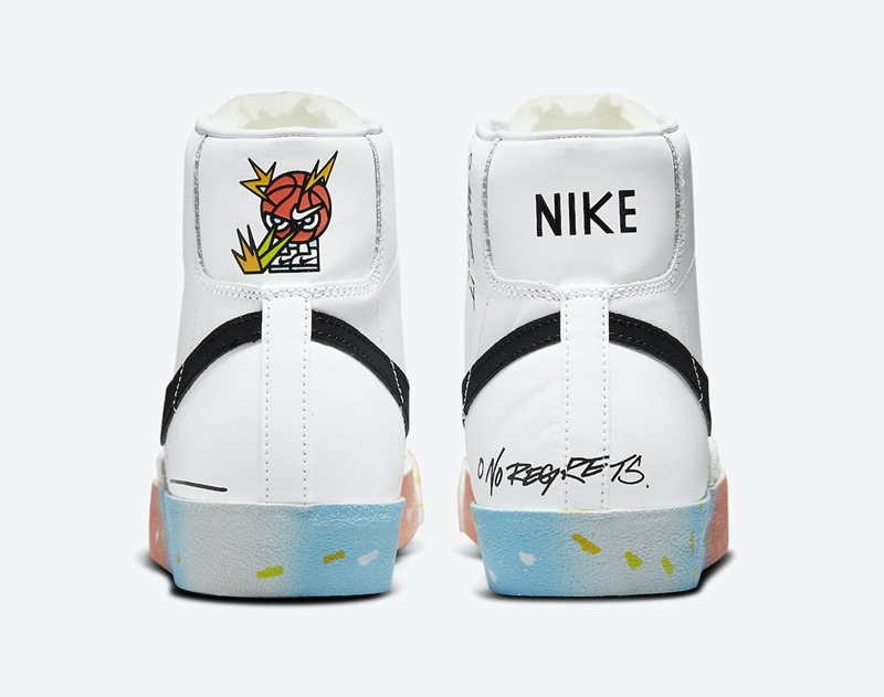 这款涂鸦 Blazer Mid 鞋身以白色皮革为基底,饰以黑色 Swoosh logo 点缀。最醒目的设计在于中底处渐变涂鸦以及鞋舌、后跟处卡通图案元素,可以说是大大提升了鞋款的趣味性与吸睛度。