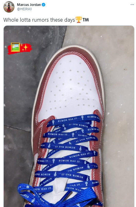 Trophy Room 主理人乔丹儿子 Marcus Jordan 近日曝出了一款前所未见的蓝色鞋带版本。