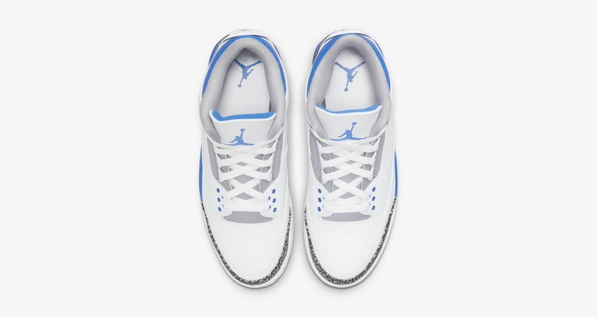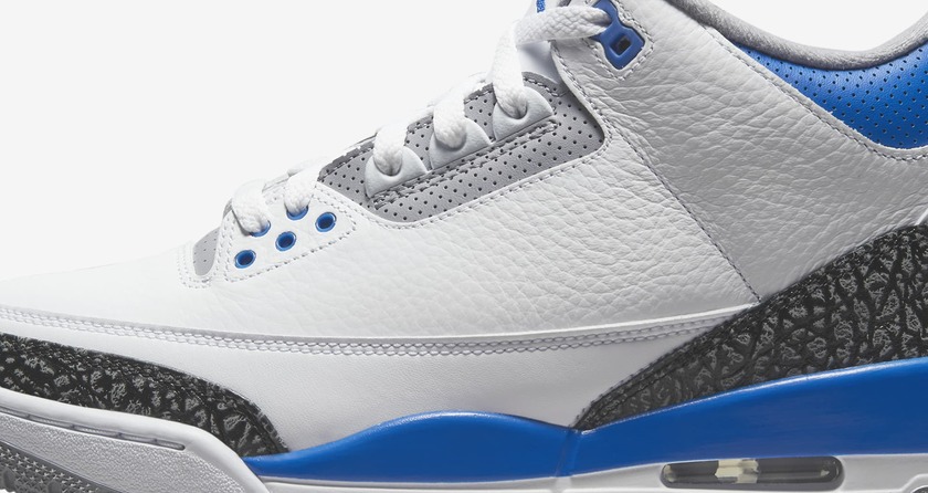 最近全新配色的 Air Jordan 3 “Racer Blue” 在网络上曝光了官图!整双鞋以白色荔枝皮为主要配色,搭配谈蓝色和标志性的爆裂纹,体现出无与伦比的高级质感。并且整双鞋的配色和藤原浩的「闪电」Air Jordan 3 非常相似。