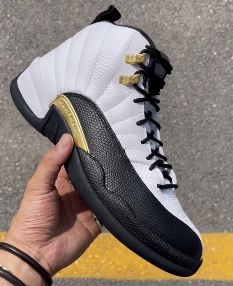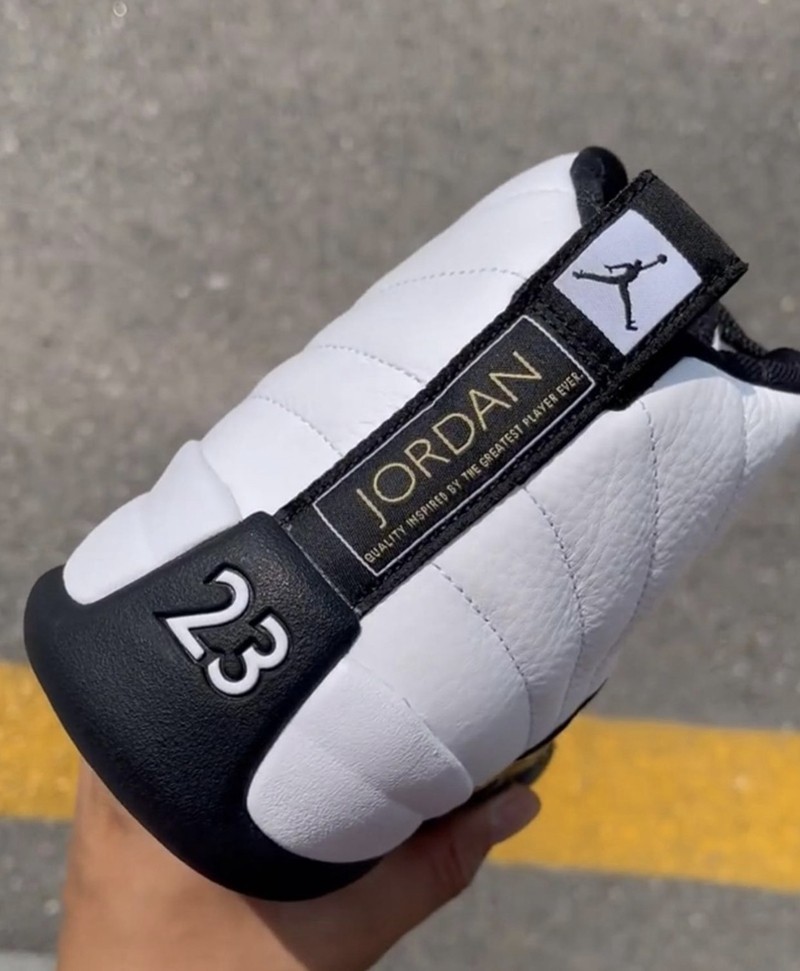 最近 Air Jordan 品牌公布了一款与 Air Jordan 12“Taxi”非常相似的全新鞋款。整双鞋主体使用黑白双色拼接,与“Taxi”几乎一模一样,区别的地方在鞋身侧面 TPU 及鞋舌由黑色变为了金色,外底的碳板也由黑黄双色改为了纯黑色。