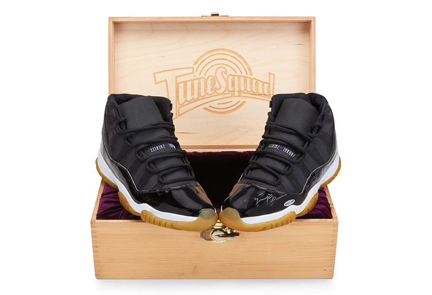 虽然詹姆斯主演的《空中大灌篮 2:新传奇》上映初期的口碑不佳,但电影相关的一切话题仍然是最近的热点。近日苏富比拍卖行就上架拍卖了了一双《空中大灌篮1》主演乔丹亲签的 Air Jordan 11 “Space Jam” 球员 Sample 版本,该鞋的尺码为 US13 而且全新的。从拍卖照片中看到,这双鞋左脚的鞋头部位有乔丹的亲笔签名,且配有木质的特殊鞋盒。
