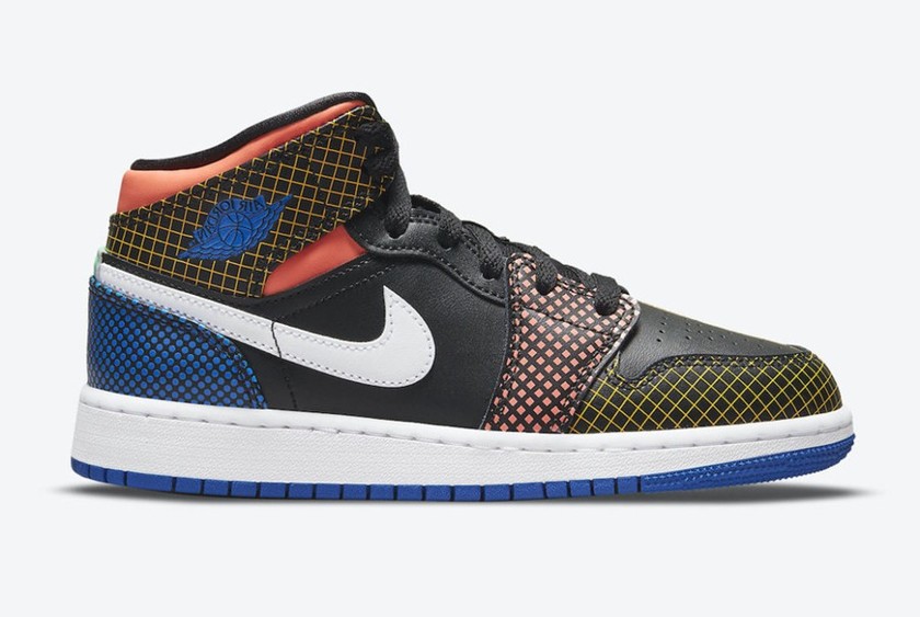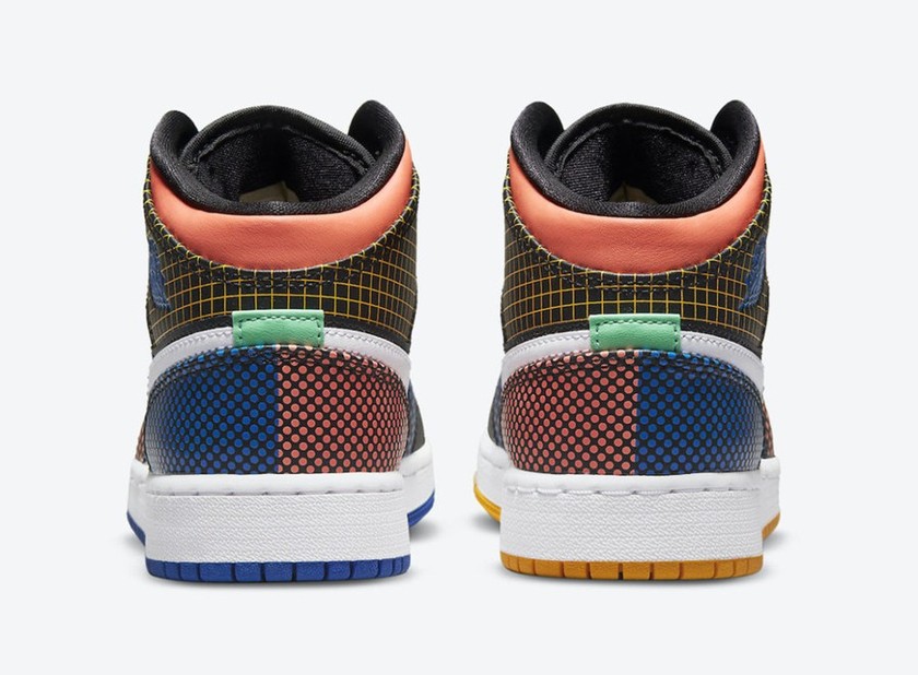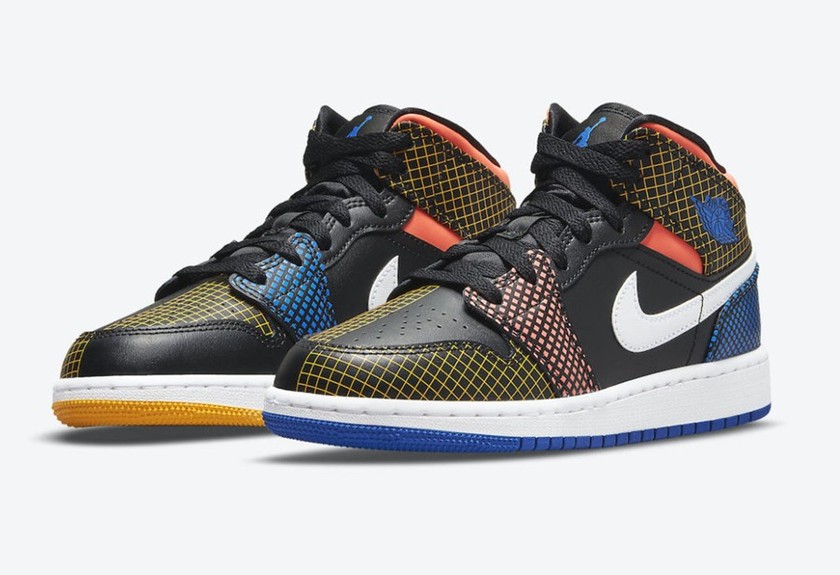 最近 Air Jordan 1 Mid “Multicolor Gird Pattern” 在网络上上曝光了官图。该款鞋目前公布仅有 GS 尺码,整双鞋采用了黄、粉、橙、蓝、绿多种颜色融合的花哨设计,Swoosh Logo 和中底则使用白色搭配,视觉效果十分出众。