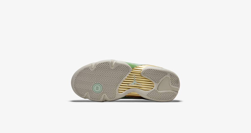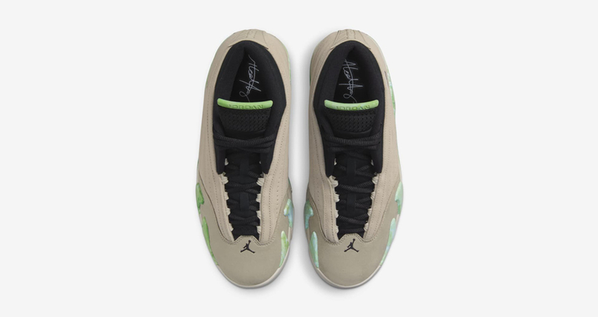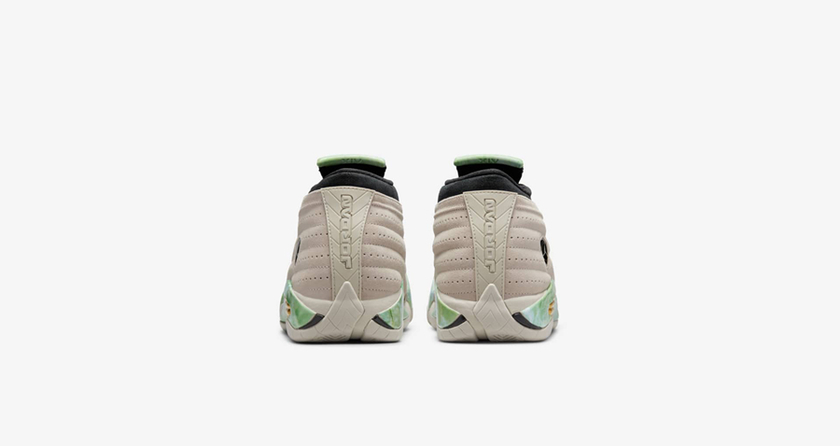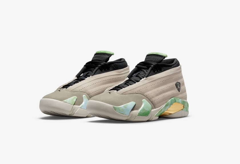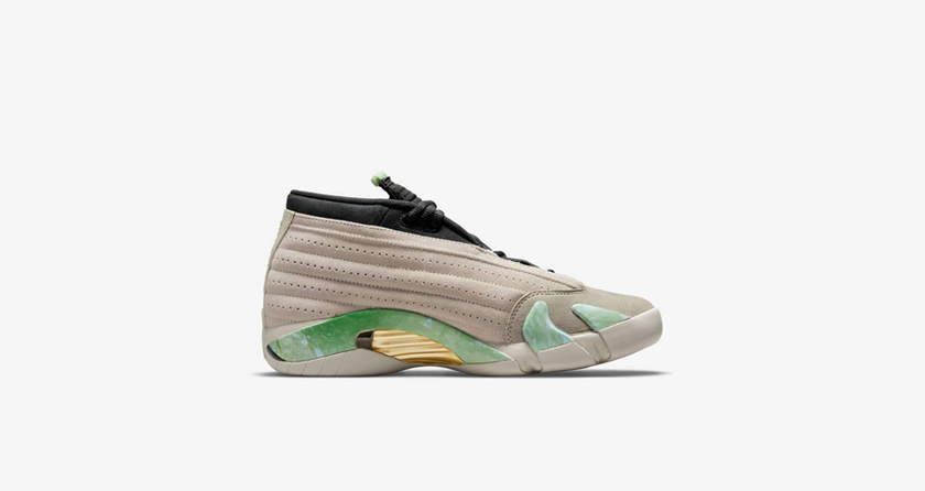 最近 Air Jordan 品牌公布了一双全新 Air Jordan 14 RTR Low SP 的官图。整双鞋以浅灰色打孔麂皮为基础,搭配绿色大理石纹路的中底线条,配色上与 Air Jordan 14 兵马俑颇为相似,整体造型简约时尚。